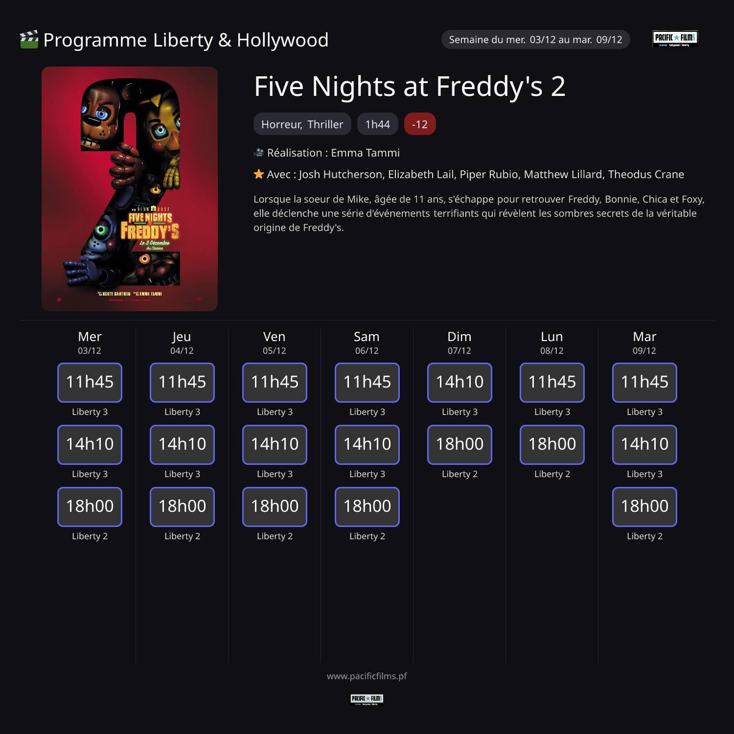 Lorsque la soeur de Mike, âgée de 11 ans, s'échappe pour retrouver Freddy, Bonnie, Chica et Foxy, elle déclenche une série d'événements terrifiants qui révèlent les sombres secrets de la véritable origine de Freddy's.